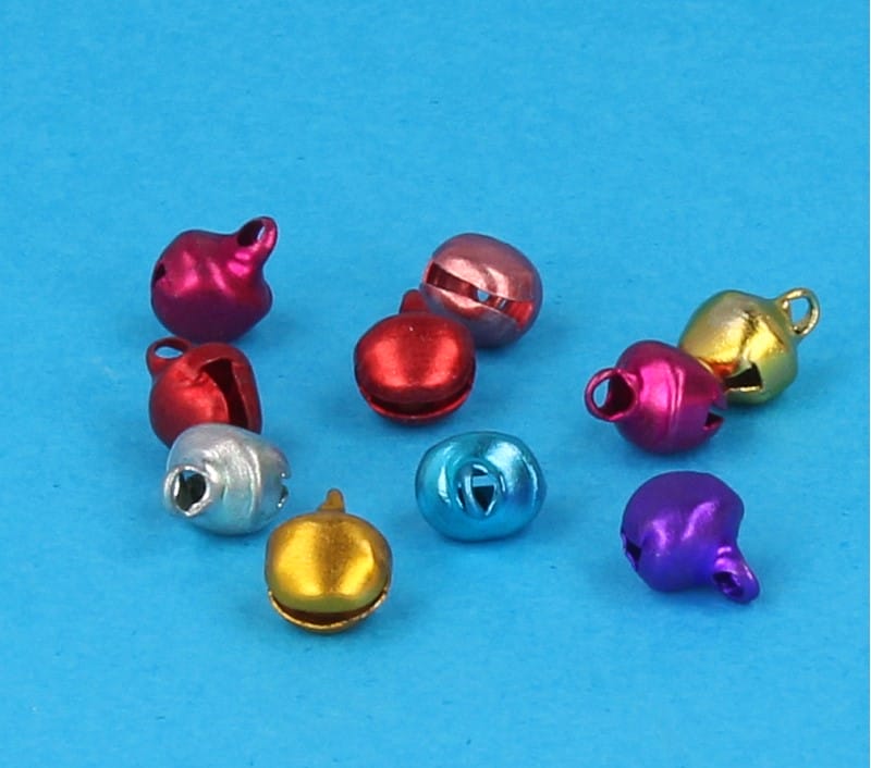Set of 10 miniature jingle bells for decoration. Assorted colors.
