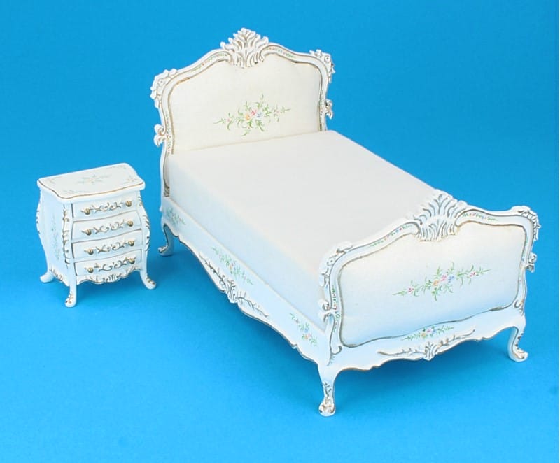 Single bed with a headboard and footboard decorated with floral details, accompanied by a nightstand with three drawers and a matching design. Both pieces of furniture have a white finish with golden details and painted floral motifs.