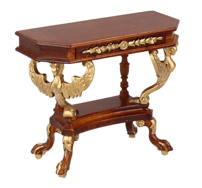 Wall-mounted wooden table with golden details in the shape of winged figures and clawed legs. It features a small drawer decorated with golden floral motifs.