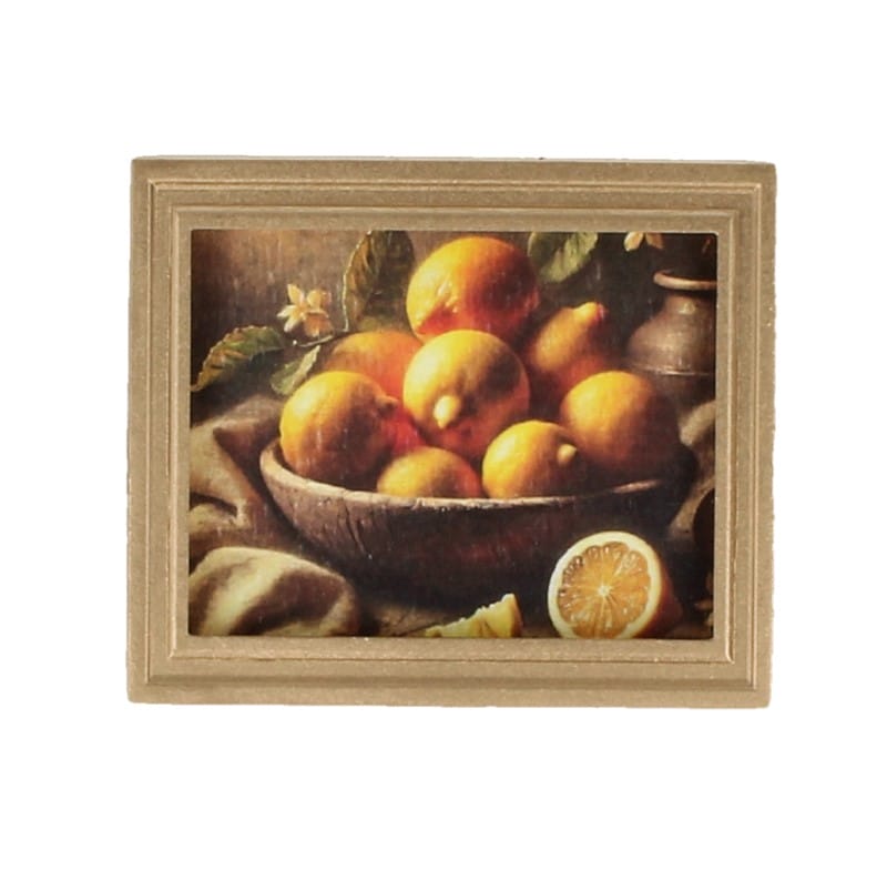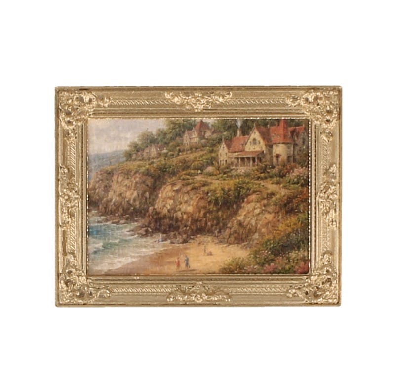 Framed painting depicting a coastal scene with a beach, a rocky cliff, and several houses on the cliffside.